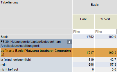 Im unteren Beispiel bewirkt die Aktivierung des Auto Filters, dass das Merkmal „Nutzungsorte Laptop/ Notebook“ unter dem Filter „Tragbarer Computer wird genutzt“ gezählt wird.